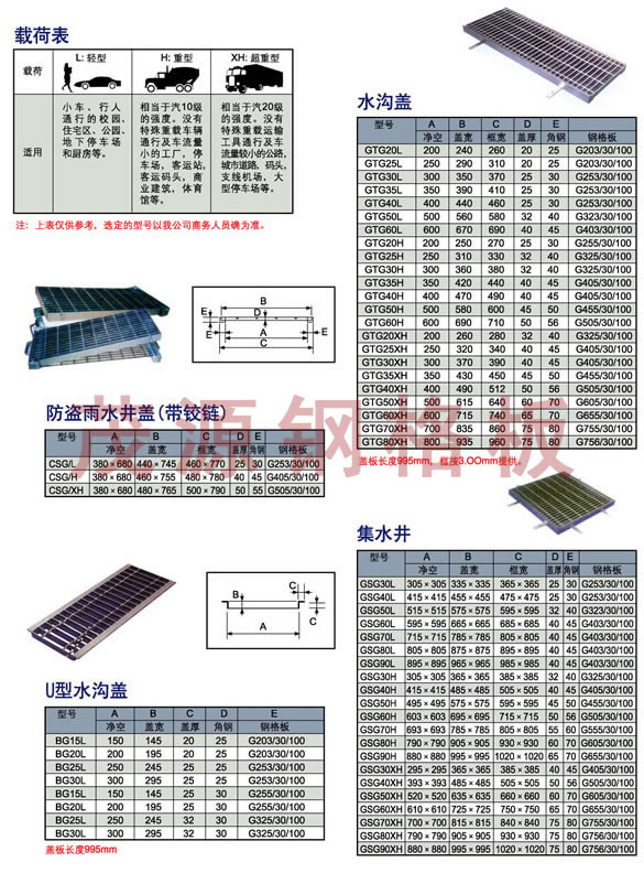 | 采用鋼格板設(shè)計制造,廣泛用于城市道路、廣場、園林、碼頭、機場、停車場、公路、鐵路、工業(yè)工程等各類工業(yè)民用建筑。 產(chǎn)品特點: 外形美觀:線條簡捷,銀色外表,現(xiàn)代潮流。 最佳排水:漏水面積達83.3%,是鑄鐵的兩倍多。 熱浸鍍鋅:防銹力強,免維護及更換。 防盜設(shè)計:蓋與框用鉸聯(lián)接,防盜,安全,開啟方便。 節(jié)省投資:大跨,重載時,比鑄鐵價低且節(jié)省被盜或壓碎更換的費用。 高強度:強度和韌性遠離于鑄鐵,可用于碼頭,機揚等大跨度和重載荷的環(huán)境。 規(guī)格多:滿足不同環(huán)境、載荷、跨度、尺寸及形狀所需。 | ||||||||||||||
